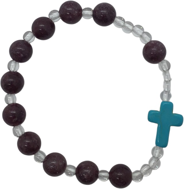 素材選びから制作にいたるまで、キリスト教カトリックの聖職者よって丁寧に仕上げられた、天然石ロザリオブレスレットです。 伸縮素材に通して編まれているので伸縮性があり、丈夫で長持ちするのも特徴です。 信心用具として、また、手首につけるアクセサリーとしても幅広くご利用ください。 祈りのひとときに、そっと寄り添う天然石ロザリオブレスレット。 それぞれ異なる表情をもつ天然石は、古くから人々の想いや祈りとともに用いられてきました。 一粒一粒の石に込められた静かな意味に思いを向けながら、 日々の中に短い沈黙と祈りの時間をもたらしてくれるブレスレットです。 ※天然石の意味は、古来より伝えられてきた言い伝えによるものであり、 効果を保証するものではありません。 ~レピドライトについて~ 淡い紫色から藤色のやさしい色合いが印象的なレピドライト。 雲母を含む天然石で、きらりとした微細な輝きを内に秘めています。 心の緊張をやわらげ、感情の波を静かに整える石といわれ、 変化の時を穏やかに受けとめる助けとなる存在として親しまれてきました。 祈りや黙想の時間に、静けさと安らぎをもたらしてくれる天然石です。 ~練ターコイズについて~ 古くから世界中の装飾品につかわれていたターコイズ。その爽やかで独特の色合いが、多くの人を惹きつけました。練ターコイズは、ターコイズの粉末に樹脂を加えて固めたものです。 形を整えやすくデザイン性が高いものに使われています。 ~ロッククリスタルについて~ 水晶の中でも特に透明度が高いものを、ロッククリスタルといいます。その透明感から、古い時代には氷の化石と信じられ、多くの部族が「魔法の石」として重宝していたようです。 ※ロザリオとは?※ ロザリオの祈りを唱える際に、回数を間違わずに正確に祈るために用いる、数珠状の信心用具のことです。 最初の1つめの珠で「主の祈り」を唱え、続く10個の珠で「アヴェ・マリアの祈り」を10回唱えて1連となります。通常はこの1連を5回繰り返すのが正式なロザリオの祈りです。 ____________________ 素材:天然石 サイズ:内側円周/約16cm、珠の直径/大:0.8cm・小0.3cm、十字架/1.5cm×1.2cm 製造者:宗教法人 聖パウロ修道会