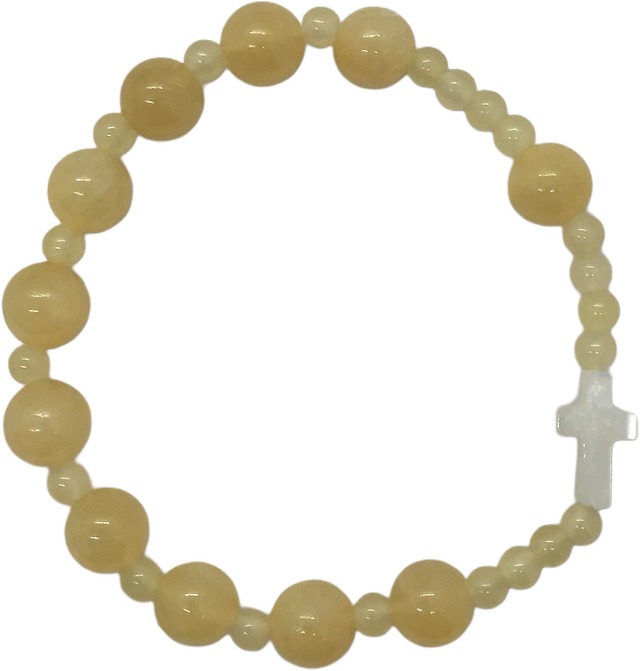素材選びから制作にいたるまで、キリスト教カトリックの聖職者よって丁寧に仕上げられた、天然石ロザリオブレスレットです。 伸縮素材に通して編まれているので伸縮性があり、丈夫で長持ちするのも特徴です。 信心用具として、また、手首につけるアクセサリーとしても幅広くご利用ください。 祈りのひとときに、そっと寄り添う天然石ロザリオブレスレット。 それぞれ異なる表情をもつ天然石は、古くから人々の想いや祈りとともに用いられてきました。 一粒一粒の石に込められた静かな意味に思いを向けながら、 日々の中に短い沈黙と祈りの時間をもたらしてくれるブレスレットです。 ※天然石の意味は、古来より伝えられてきた言い伝えによるものであり、 効果を保証するものではありません。 ~アラゴナイトについて~ アラゴナイトは、やわらかな蜂蜜色や砂のような温かみをもつ天然石で、 心を落ち着かせ、日々の緊張を静かにほどいてくれる石といわれています。 感情の揺れを整え、焦りや怒りを和らげる力があるとされ、 祈りや黙想の時間にそっと寄り添う存在です。 足元をしっかりと大地につなぎ、「今ここに在る」ことを思い出させてくれる石ともいわれています。 ~マザーパールについて~ 白色とクリーム色が混ざり合うやさしい色合い。マザー・オブ・パールは、「真珠の母」とも呼ばれています。その名が指し示すように、真珠を作り出す母体となる貝からできた天然石です。母性や親子愛、慈愛などを象徴する石として古来より装飾品などに使われてきたようです。 ※ロザリオとは?※ ロザリオの祈りを唱える際に、回数を間違わずに正確に祈るために用いる、数珠状の信心用具のことです。 最初の1つめの珠で「主の祈り」を唱え、続く10個の珠で「アヴェ・マリアの祈り」を10回唱えて1連となります。通常はこの1連を5回繰り返すのが正式なロザリオの祈りです。 ____________________ 素材:天然石 サイズ:内側円周/約16cm、珠の直径/大:0.8cm・小0.3cm、十字架/1.5cm×0.7cm 製造者:宗教法人 聖パウロ修道会