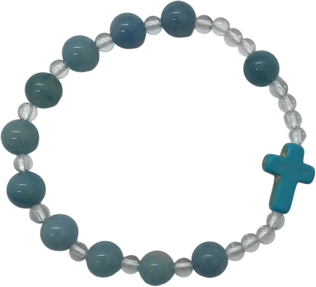 素材選びから制作にいたるまで、キリスト教カトリックの聖職者よって丁寧に仕上げられた、天然石ロザリオブレスレットが登場しました。 信心用具として、また、手首につけるアクセサリーとしても幅広くご利用ください。 伸縮素材に通して編まれています。 ~アクアマリン~ アクアマリンはベリル(緑柱石)という鉱物の一種です。もともとベリルは透明に近いカラーレスな石ですが、結晶内に含まれる成分や不純物によって美しく発色し、その色彩によって宝石名がつけられています。宝石としても珍重され、その名の由来はラテン語の”海の水”によるものです。 ~ロッククリスタルについて~ 水晶の中でも特に透明度が高いものを、ロッククリスタルといいます。その透明感から、古い時代には氷の化石と信じられ、多くの部族が「魔法の石」として重宝していたようです。 ※ロザリオとは?※ ロザリオの祈りを唱える際に、回数を間違わずに正確に祈るために用いる、数珠状の信心用具のことです。 最初の1つめの珠で「主の祈り」を唱え、続く10個の珠で「アヴェ・マリアの祈り」を10回唱えて1連となります。通常はこの1連を5回繰り返すのが正式なロザリオの祈りです。 ____________________ 素材:天然石 サイズ:円周/約16cm、珠の直径/大:0.8cm・小0.3cm、十字架/1.6cm×1.3cm 製造者:宗教法人 聖パウロ修道会