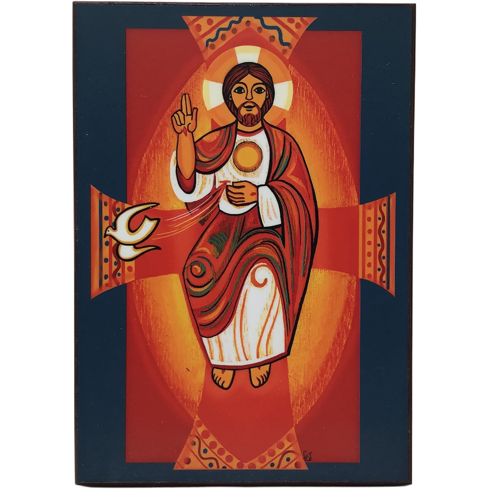 中世のキリスト教美術でよく描かれるイメージで、天の王として威厳を持ち、玉座に座るキリストの姿を指します。しばしば手を祝福の形にあげ、もう一方の手に福音書を持ち、裁き主や支配者としての権威を象徴しています。