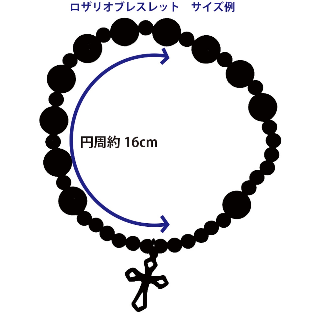 サイズ:円周/約16cm、珠の直径/大:0.8cm・小0.3cm、十字架/1.5cm×0.7cm