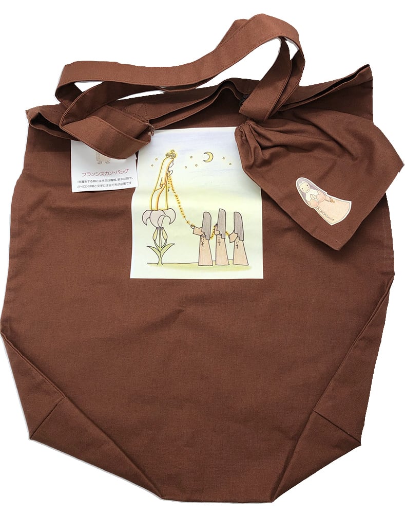 聖クララ会のシスターが、丁寧に手作りで制作したトートバッグです。使用しないときは、かわいらしいイラストの入った小袋に収納してください。